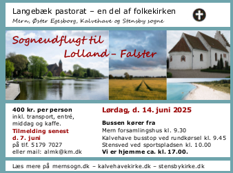 Igen i år er der sogneudflugt med Langebækkirkerne. Dagen er lørdag d. 14. juni og turen går til særværdigheder på Lolland-Falster med frokost på restaurant og med kaffepause undervejs.