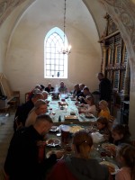 Tyve børn, forældre, bedsteforældre mm. var mødt op i kirken kl. 16.30. Børnekoret sang nogle fine efterårssange, og så fik børn og voksne mulighed for at deltage i et skuespil. Det handlede om tolderen Zakæus, som opkrævede alt for mange skattepenge (popcorn) af folket, men blev omvendt da han mødte Jesus – her i Mern kirke! –, ved at kravle op ad et mulbærfigentræ – her symboliseret af vores prædikestol med de mange grønne grene. Jesus fulgte med ham til Zakæus’ hus (i vores dåbskapel) og til sidst endte alle folkeskarene med at spise sammen med Zakæus. Mon de også dengang spiste spaghetti?